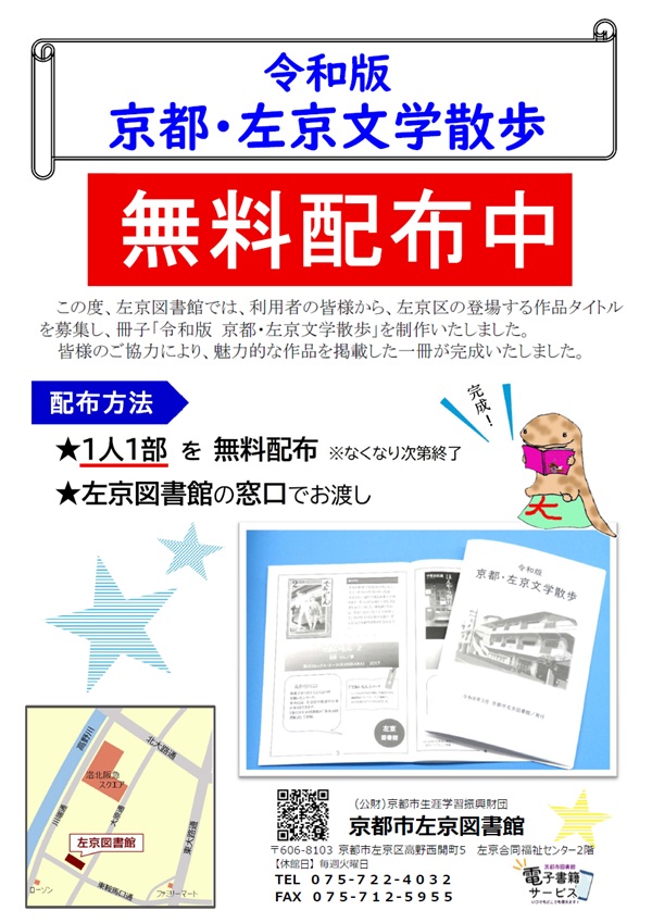 この度、左京図書館では、利用者の皆様から、左京区の登場する作品タイトルを募集し、冊子「令和版 京都・左京文学散歩」を制作いたしました。