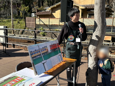 大型絵本の読み聞かせでは、職員の「しゅっぱつしんこう!」の掛け声に合わせて、お客様も「しゅっぱつしんこう!」と手を挙げて言ってくださりました。