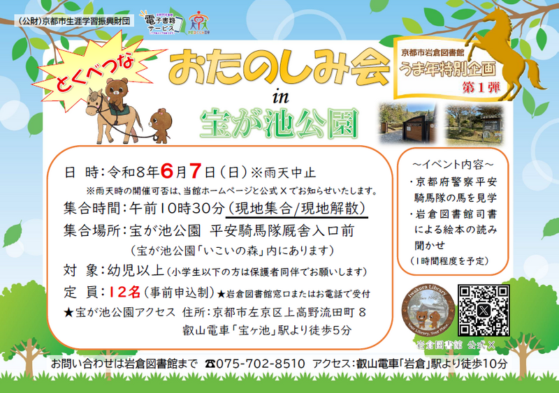 昨年度、「開館30周年記念 公式X」として運用していました、当館の公式Xですが、令和8年度より正式に「京都市岩倉図書館 公式X」として、運用することになりました。
