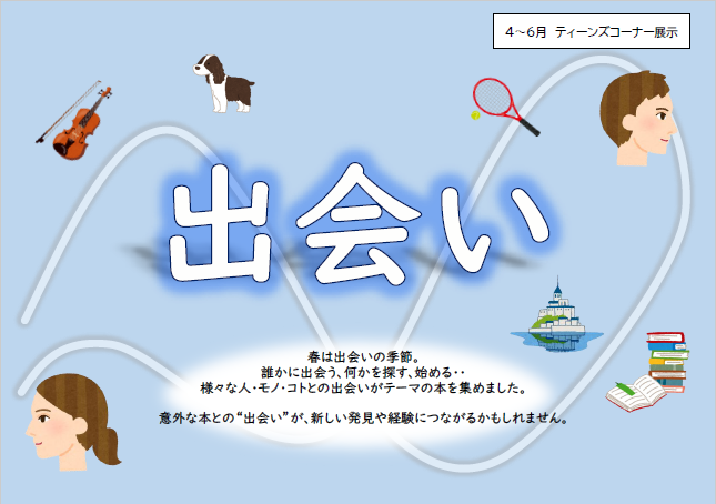 4月~6月の展示 投稿日時 : 04/01 右京中央図書館 4月~6月のティーンズコーナーの展示は「出会い」です。 春は、新しいひと・こと・ものとの出会いにあふれています。 そんな「出会い」にまつわる本を集めました。 ぜひ様々な本を手に取って、本との「出会い」を楽しんでください。