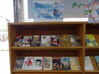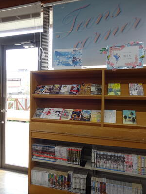 上の面出し棚は、左側がティーンズマンガ、右側がティーンズ展示と新着本になります。